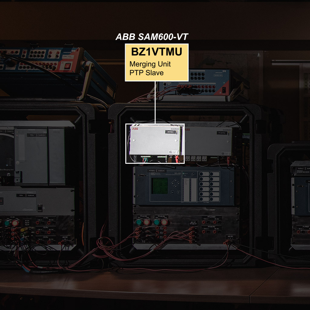 The substation primary equipment is simulated using CB simulator relays and physical current and voltage injections, and our equipment racks have wheels, but the rest of the system is built using the same physical devices as could be used in a real substation: protection IEDs, merging units (SAMU / PIU), utility-grade Ethernet switches and satellite clocks.